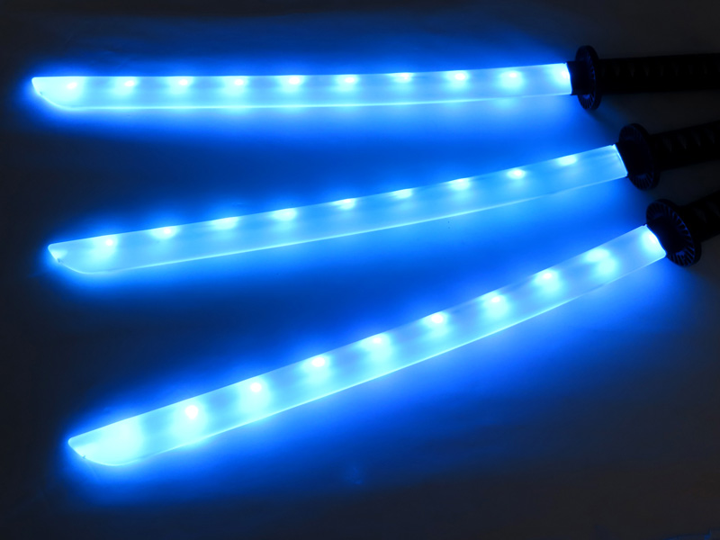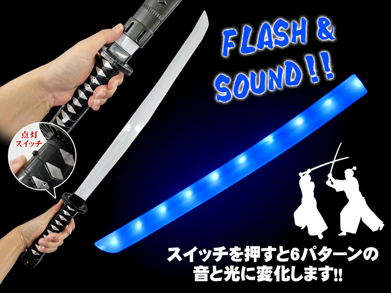 全長約680mm!暗闇で青く輝く鞘付き日本刀『S/F流星YAIBA』が登場☆☆☆彡持ち手のボタンでライトオーン!刃が青く輝きアクションサウンドが流れます。(※連続して押すと6パターンの音と光に変化!)日本刀の光るソードは男の子向けの光る景品玩具に大人気の商品です!