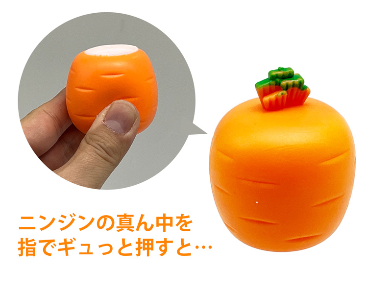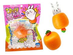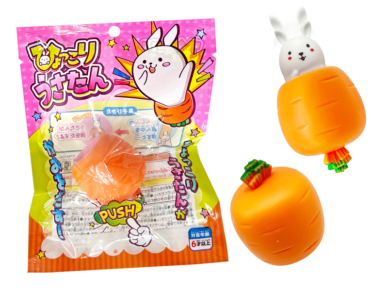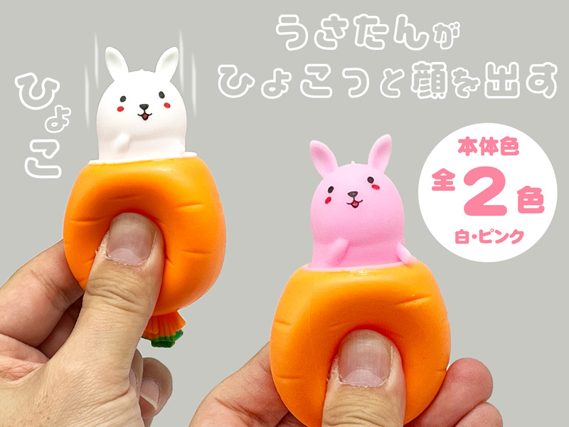 ニンジンの中からコンニチは~!!『ひょっこり うさたん』が登場!ニンジンの真ん中を握ると…うさたんがひょこっと顔を出します!指を離すと引っ込みます。本体カラーは全2色。飲食店さん向けのランチ景品や各種イベント景品玩具にゼヒ!