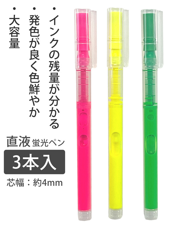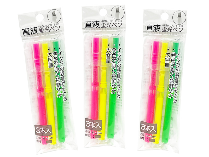 色鮮やかでたっぷり使える蛍光ペン3本セットが登場!最大の特徴は、インク残量がひと目でわかるクリアボディ。いざという時のインク切れを防ぎ、最後まで計画的に使い切ることができます。芯幅は約4mmと、教科書や書類の重要なポイントをしっかりとマークするのに最適な太さです。誰にでも喜ばれる実用的な文具として、来店記念品や展示会の販促品にも最適です。