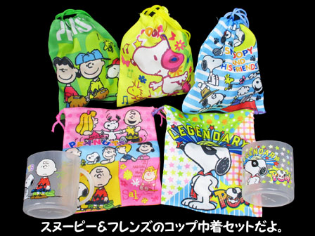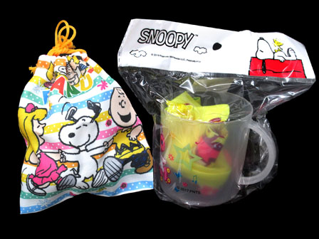 【スヌーピー&フレンズ】のコップ&ミニ巾着セットが新登場。コップと巾着にはそれぞれキャラクターのイラストがプリントされています。柄はドドンと全8種類。お子さま向けのランチグッズにご褒美プレゼント・キャラクター景品などにオススメですよ。