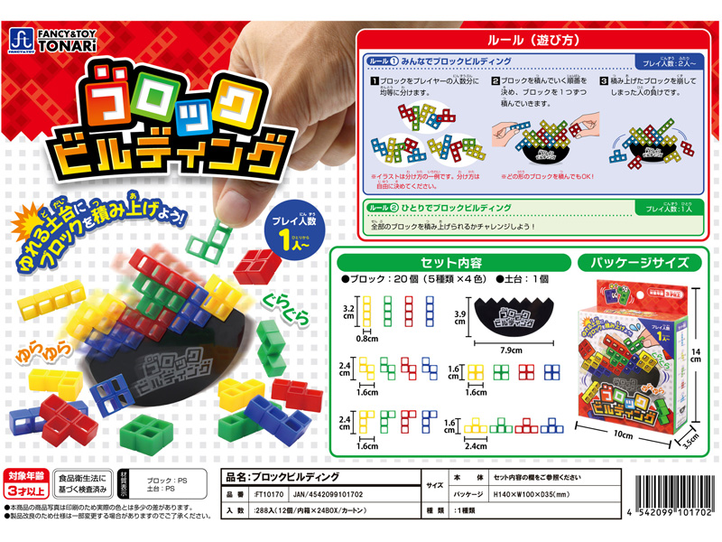 集中力が勝負の決め手!ゆれる土台の上にブロックを積み上げるゆらゆらバランスゲーム「ブロックビルディング」です。箱の中には…(土台1個、ブロック20ピースが入っております) 飲食店のお子様景品やお祭り・縁日の射的用の自立景品にゼヒ