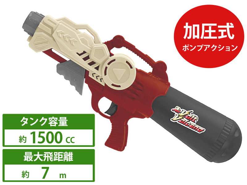 大迫力のポンプアクションウォーターガン【エアヴォルトヴォルケーノ】が登場!タンクは大容量の約1500CC!ポンプレバーを前後にスライドさせ内部の空気を圧縮!引き金を引いて、勢いよく水を発射しましょう!!お祭り・縁日や各種イベントの景品・プレゼントにはモチロンのこと、キャンプや川遊び・海水浴など夏のアウトドアのお供にもゼヒ!
