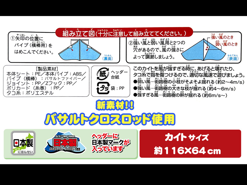 - セット内容:カイト(本体)・Zフック×1・横棒(バサルトクロスロッド)×1・タコ糸(約50m)×1