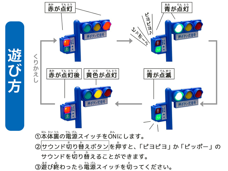 リアルっぽくてめちゃ楽しい!『光る!音がなる!信号機セット』です。信号機にはテスト電池が内蔵されているためすぐに使用可能!信号が点灯し、歩行者信号はサウンド切り替えボタンで「ピヨピヨ」か「ピッポ―」のどちらかに切り替えて音を鳴らせます。付属のミニカーは手動式のため手で転がして遊んでください(プルバックカーではありません) ごっこ遊びを通して、交通ルールを楽しく学べます☆