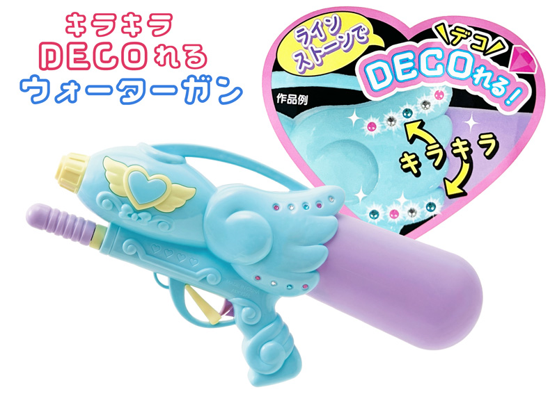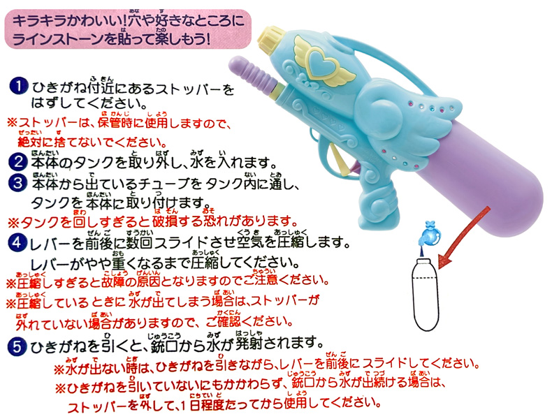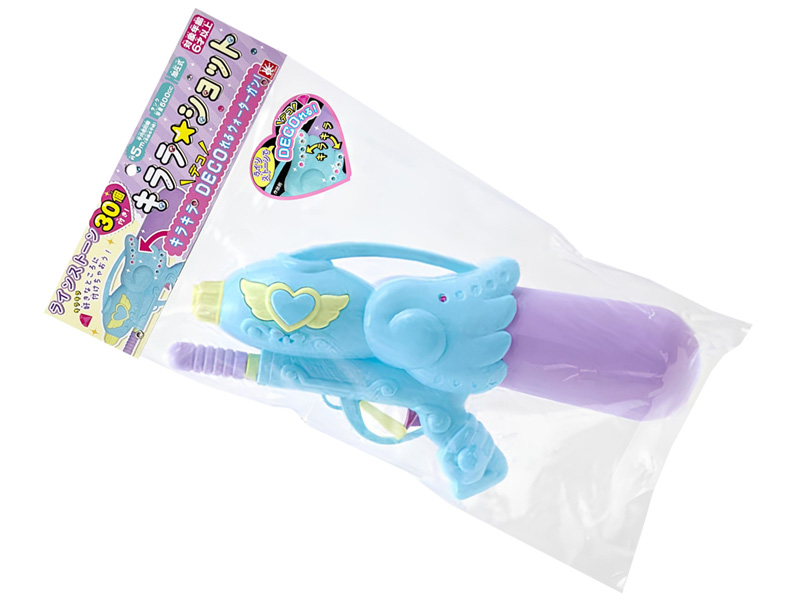 キラキラデコれる女の子向けのキュートウォーターガン【キララショット】が登場~♪付属のライトストーンで本体を装飾して遊ぶことができます。タンク容量は約600CC!ポンプレバーを前後にスライドさせ内部の空気を圧縮!引き金を引いて、勢いよく水を発射しましょう!!お祭り・縁日や各種イベントの景品・プレゼントにはモチロンのこと、キャンプや川遊び・海水浴など夏のアウトドアのお供にもゼヒ!