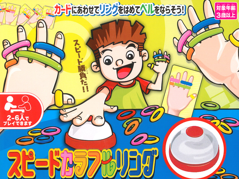 テーブルパーティーゲーム『スピードカラフルリング』が登場!!カードに描かれた色どおりにリングをはめてベルを鳴らそう!山札すべてのカードがなくなった時点でゲーム終了。もっともカードを獲得したプレイヤーが勝者です!スピードと正確さが勝負のカギ!みんなでわいわい盛り上がろう!