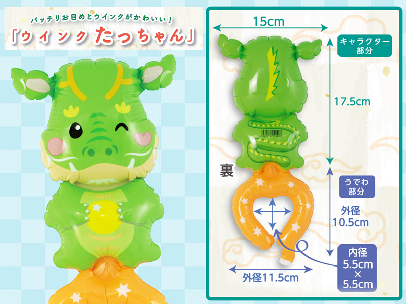 2024年は辰年ということで、パッチリお目目がかわいい【ウインクたっちゃん】が登場~!別売りのストローやポンプで膨らませると、自然にうでわ部分が折れ曲がるので、シーンによって前後に使い分けが可能!バルーンはお子様が舐めても色落ちの心配がないインサイドプリント!店頭イベントから販売商品まで幅広くお使いいただけます♪