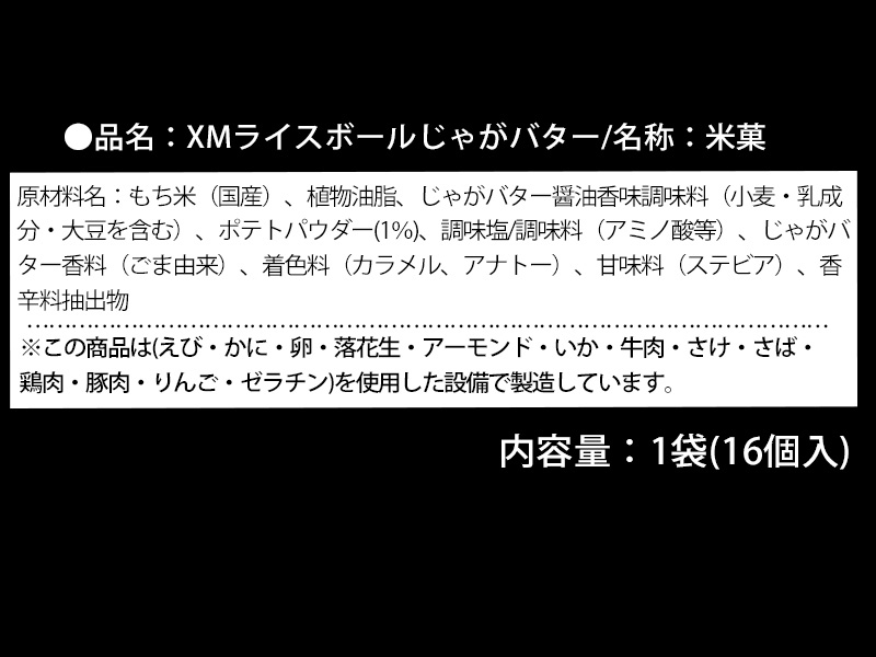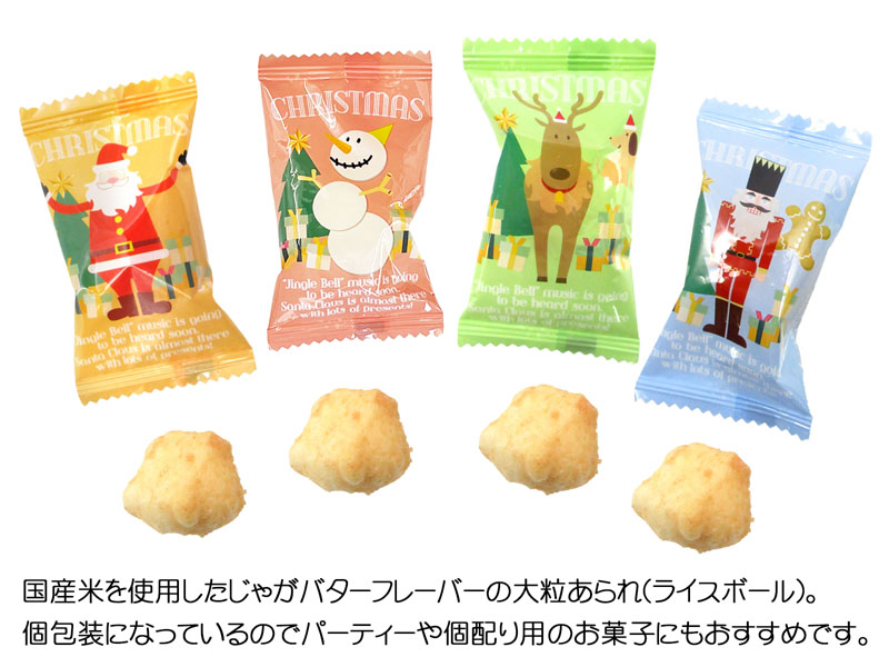 クリスマスパッケージのかわいいお菓子が新入荷♪こちらは国産米を使用したじゃがバターフレーバーの大粒あられ(ライスボール)です。かわいいクリスマス個包装がされているので、パーティーや個配りにもピッタリです。