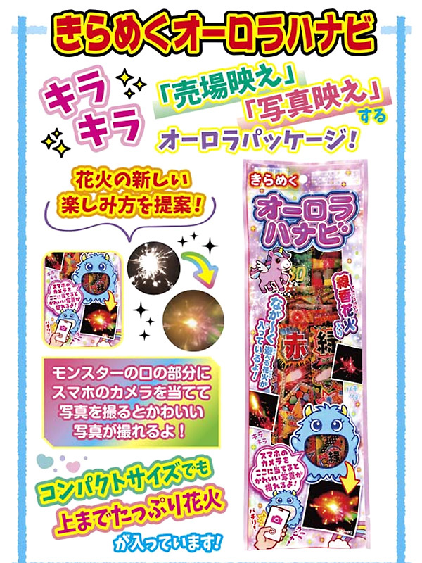 楽しい手持ち花火セットから【きらめくオーロラハナビ】が新登場~♪こちらの花火セットには長い時間遊べる花火が多く入っています。またパッケージにオーロラ加工がされてるのでスマホのカメラを当てるとかわいい写真が撮れます。