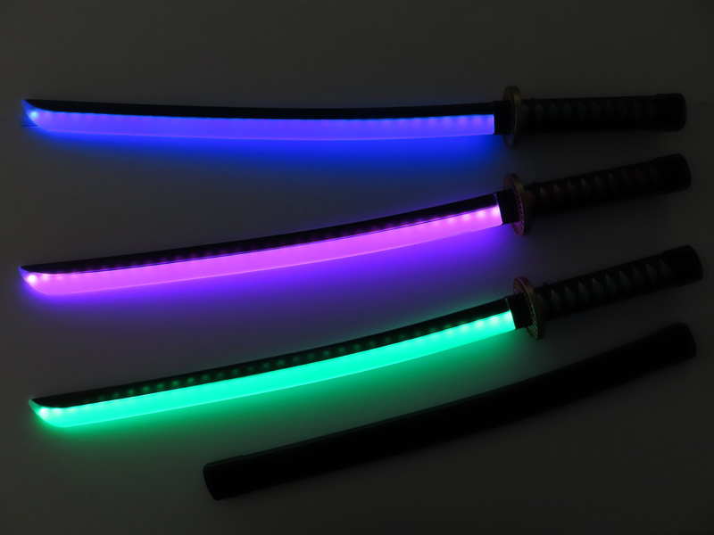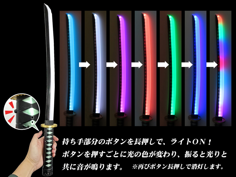 - 商品の仕様…持ち手のボタン長押しで(点灯・消灯)、ボタンを連続して押すと刀身の色が8パターンに変化/点灯している状態で振ると音が鳴ります。