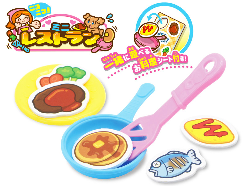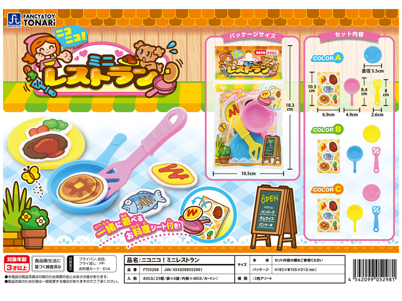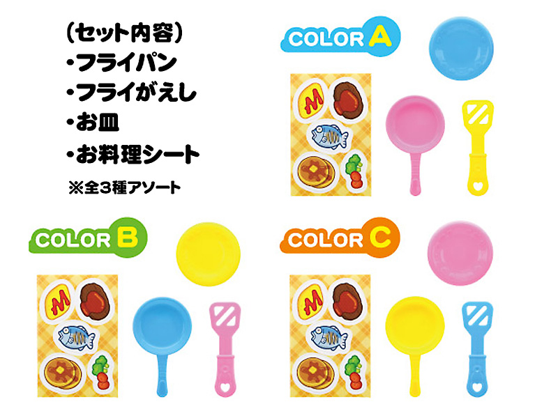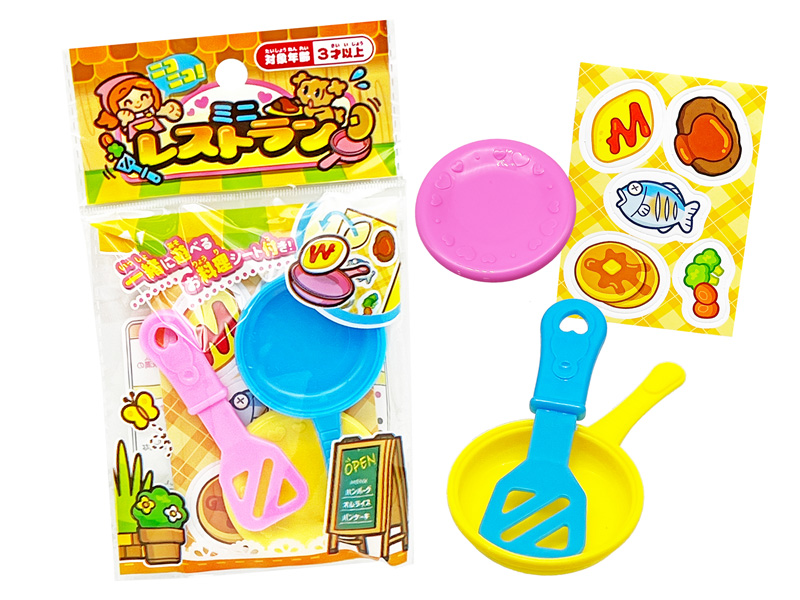 フライパン、フライ返し、お皿、お料理カードがセットになったおままごとセット【ニコニコ!ミニレストラン】が登場~♪お料理カードはお料理のイラストを手で簡単に外すことができます。※EVA素材の少し厚みのあるカードを使用しておりますので、楽しくお料理ごっこができます♪女の子子向けの景品玩具にゼヒ。