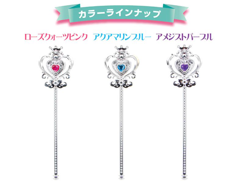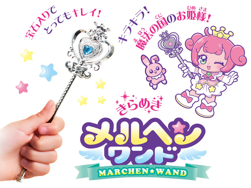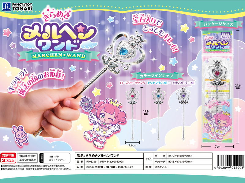 宝石入りでキラキラとってもキレイな魔法の杖『きらめきメルヘンワンド』が新登場~宝石の色は全3色展開。ステッキをクルッと回して呪文を唱えれば…気分は魔法の国のプリンセス♪玩具は個別包装されていますので、ランチセットの景品や各種イベントの販促・景品・プレゼントなどにもお渡ししやすいです。