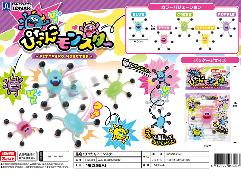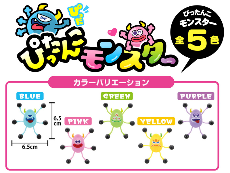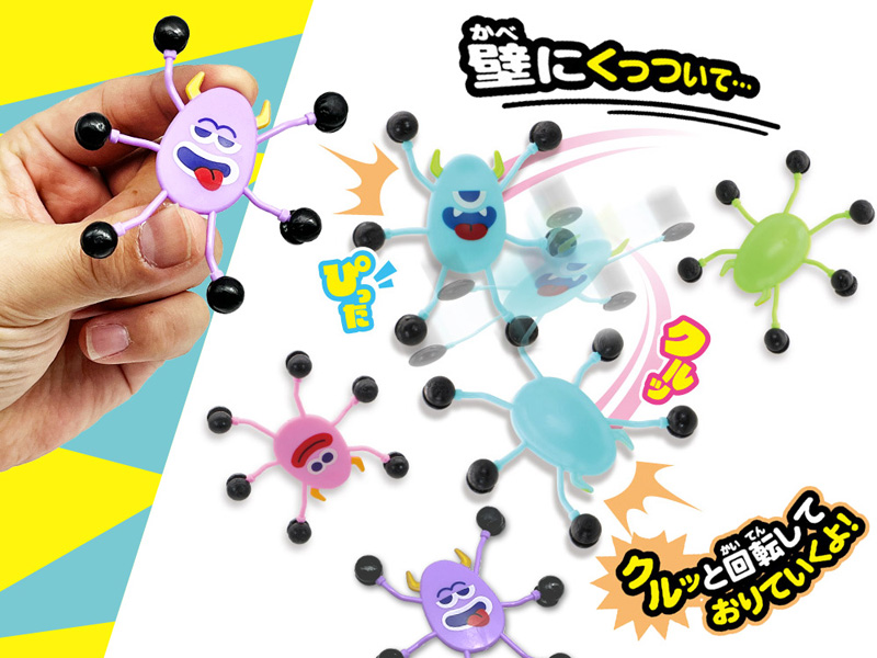 おかしなモンスター達が縦横無尽に大暴れ!?カベ降り人形【ぴったんこモンスター】が登場です!足の部分がベタベタくっつく素材になっており、ツルツルの壁にくっついてクルッと不規則に回転しながらおりていくよ!カラフルでキュートなモンスター達は全部で5種類!各種イベントの景品プレゼントにゼヒ!