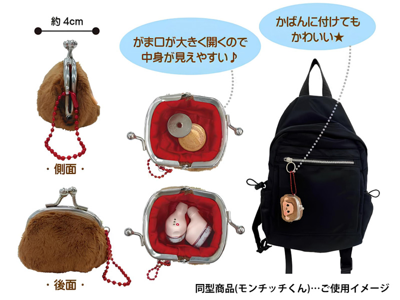 [モンチッチグッズ]に可愛いnewアイテムが続々登場~♪こちらは目薬やイヤホン、小銭など小物を入れるのにちょうどいい『プチがま口ポーチ』がま口は大きく開くので中のモノが取り出しやすい♪ボールチェーン付きなのでバッグやリュックから下げて持ち歩くこともできちゃいます♪
