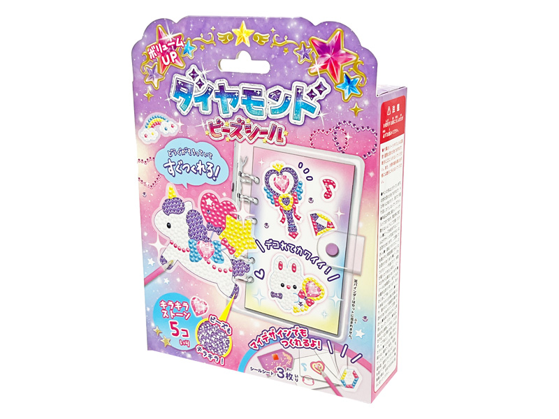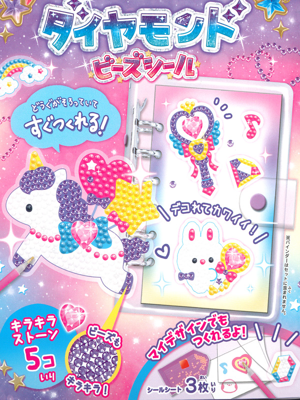 - 【セット内容】シールシート:3枚(デザイン入り2枚、無地1枚)、くっつけジェル、くっつけペン、トレー、ビーズ:6色、キラキラストーン:5個