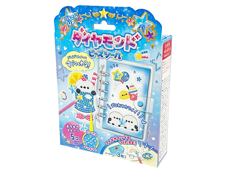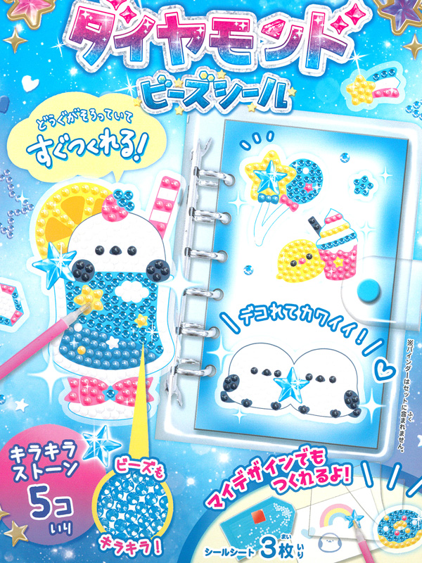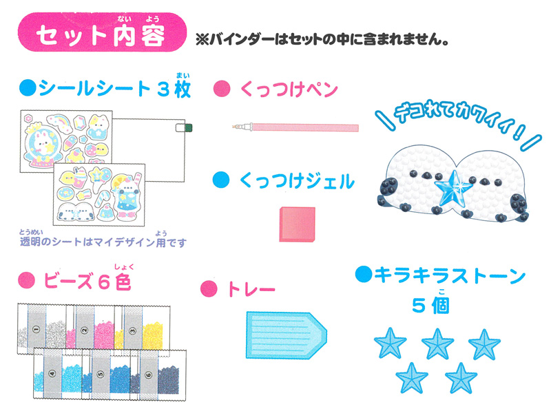- 【セット内容】シールシート:3枚(デザイン入り2枚、無地1枚)、くっつけジェル、くっつけペン、トレー、ビーズ:6色、キラキラストーン:5個
