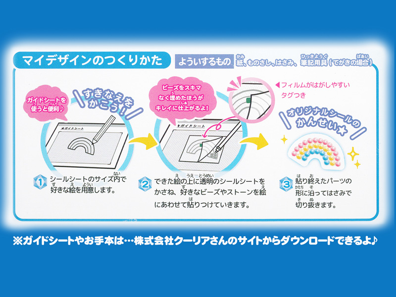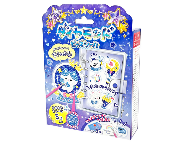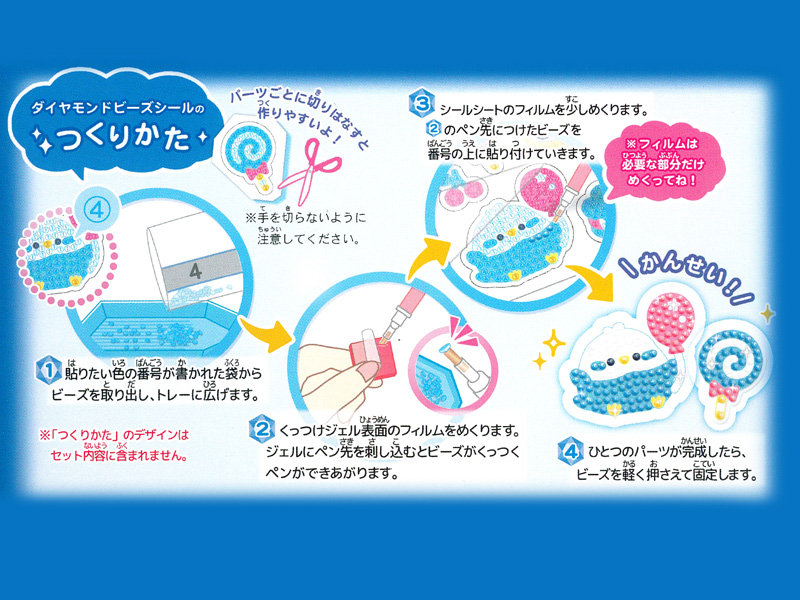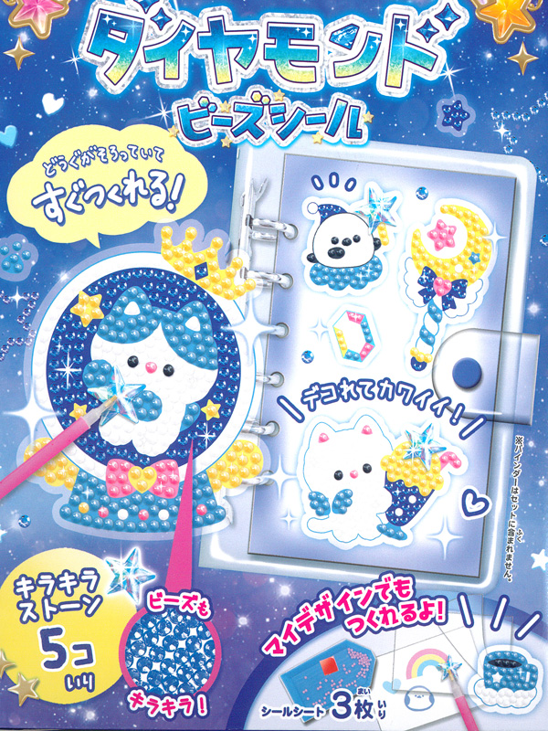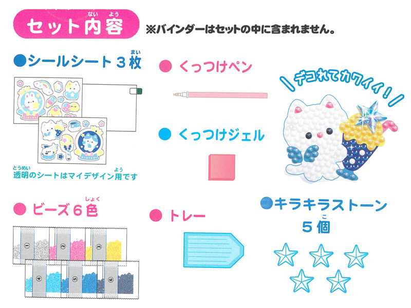 - 【セット内容】シールシート:3枚(デザイン入り2枚、無地1枚)、くっつけジェル、くっつけペン、トレー、ビーズ:6色、キラキラストーン:5個