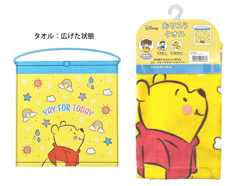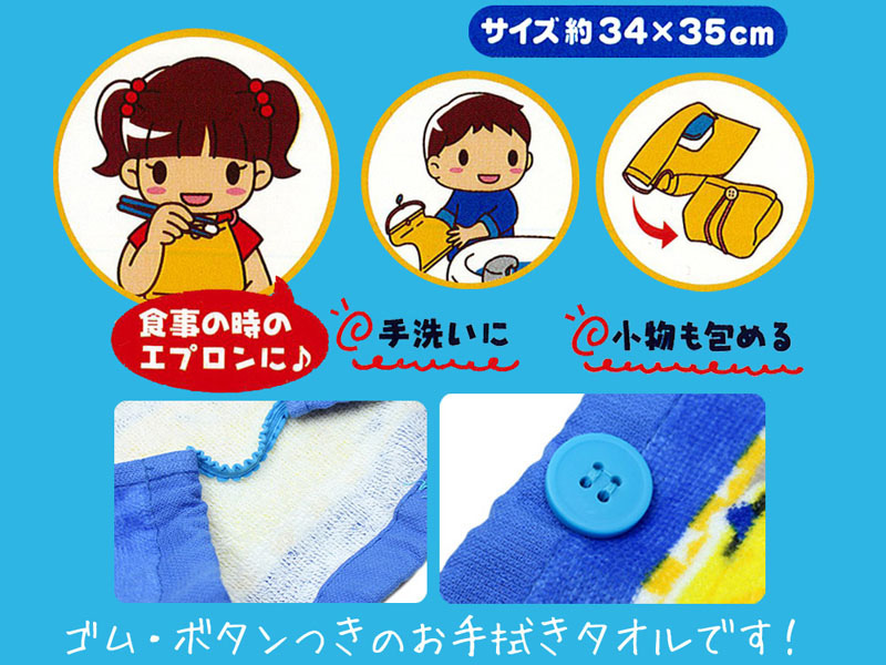 保育園やおでかけに便利なキャラクター柄のおりこうタオルが登場♪こちらはボタン付きのお手拭きタオル!お口をふけて、手もふけてエプロン(前掛け)にもなり、小物もクルクル包めて、名前の通り便利でおりこうなタオルなのです!