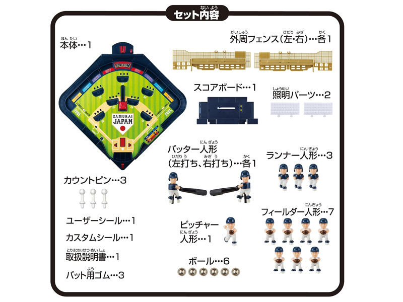 - <セット内容>野球盤本体、外周フェンス(左・右)×各1、スコアボード×1、照明パーツ×2、カウントピン×3、バッター人形(左打ち、右打ち)×各1、フィールダー人形×7、ピッチャー人形×1、ランナー人形×3、ボール×6、バット用ゴム×3、ユーザーシール×1、カスタムシール×1、取扱説明書×1