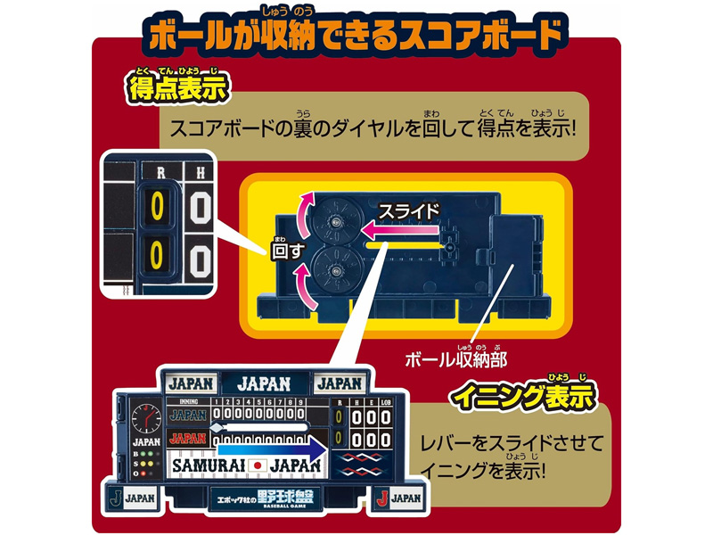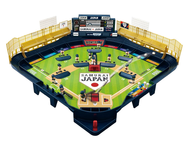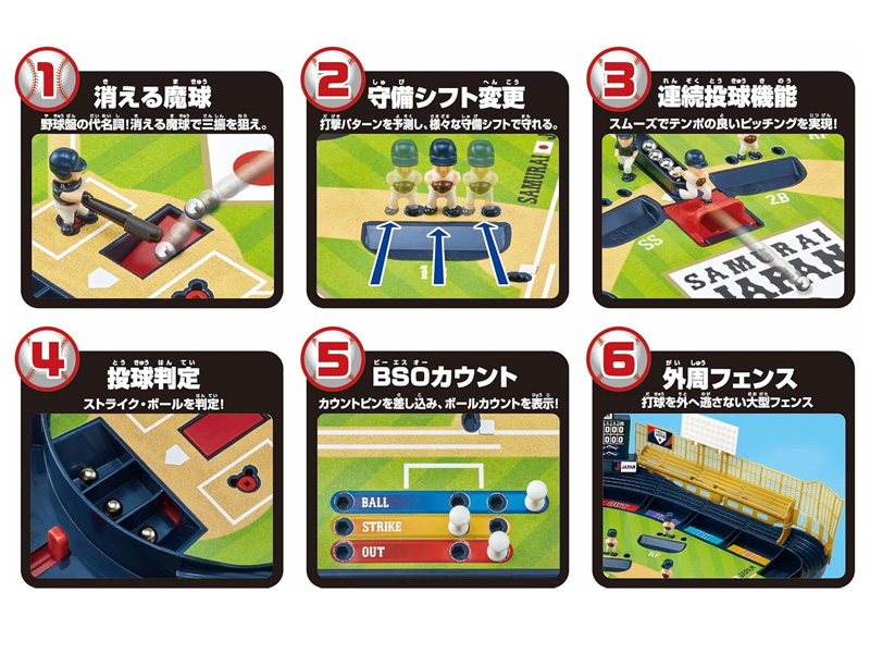 侍ジャパン野球日本代表ver.が登場!!背番号シールで選手人形をカスタマイズしよう!・選手ユニフォームカラーは侍ジャパンチームのホーム&ビジターをイメージ。・ボールが宙を飛ぶ「3Dピッチング機能」に加えて計9種類の投球が可能。・豪快なホームランが打てる「3Dバッティング機能」/「消える魔球」機能付き。・イニング/合計点数表示が可能なスコアボード付き!