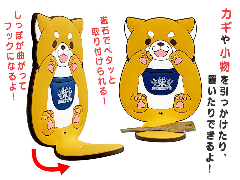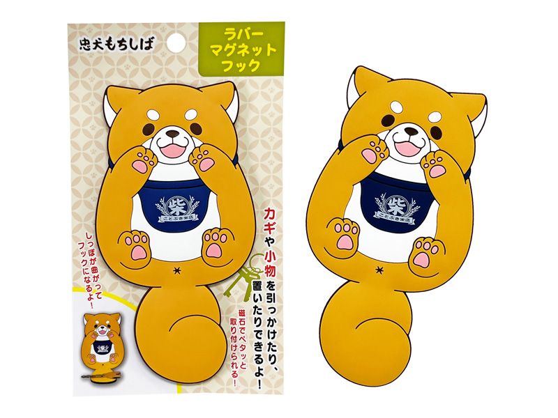 『忠犬もちしば』のおもしろアイデア雑貨が登場~♪こちらのラバーマスコットは裏面が磁石になっているので鉄製のドアなどに取り付けが可能。さらに鉄板入りのシッポは曲げられるので小物をひっかけたり置いたりできるフックに変身します!