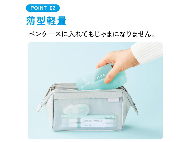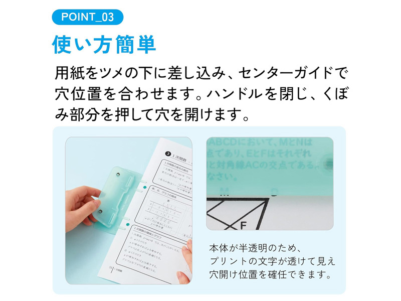 どこでもプリント整理!2穴バインダーと一緒に持ち運びができる薄型パンチが登場!●薄型軽量なので持ち運びやすい●2穴バインダーと一緒に綴じられる●本体が半透明のため、文字が透けて見え穴開け位置を確認できます。●用紙をツメの下に差し込み、センターガイドで穴位置を合わせられます。●用紙サイズガイド付き(目盛りは目安です)