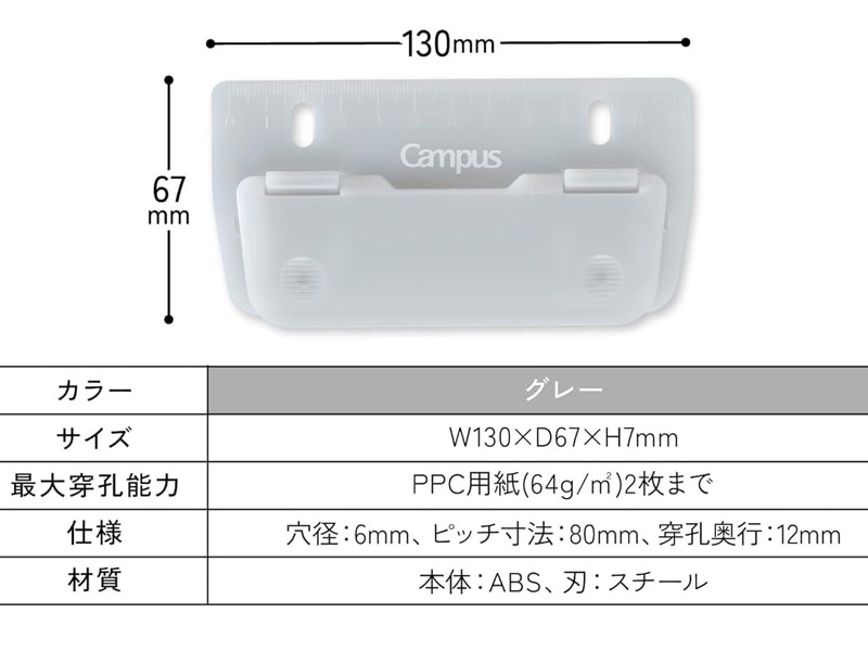 学童文具 キャンパス 2穴バインダーと一緒に持ち運べるパンチ グレー:PN-C2M