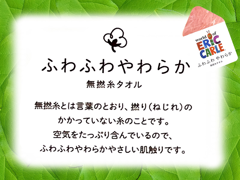 「はらぺこあおむし」のキャラクターフェイスタオルが登場♪無撚糸を使用したタオルは、ふんわりやわらかな肌ざわりで、バスタイムのほか、台所や洗面所など色々な場所で大活躍。肌ざわりがよく、かわいいタオルは、普段使いの他にも、保育園・幼稚園など教育施設さんでのプレゼントやギフト・ノベルティ、粗品にもオススメです。