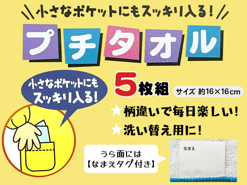 - プチタオル…全5柄(裏面にネームタグ付き)