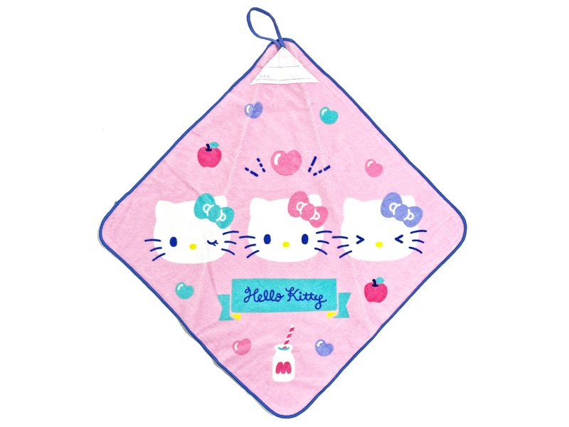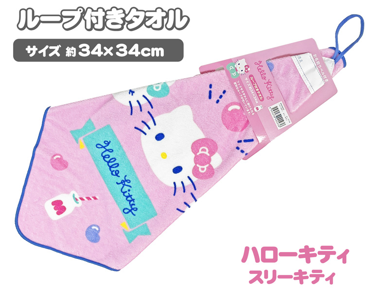 フックに掛けて使える便利な「ハローキティ」のループ式タオルが登場!!幼稚園・保育園で毎日使うものだから、お子様もお気に入りのキャラクターを使いたいですよね。タオルはコットン100%で肌触りもバツグンです。
