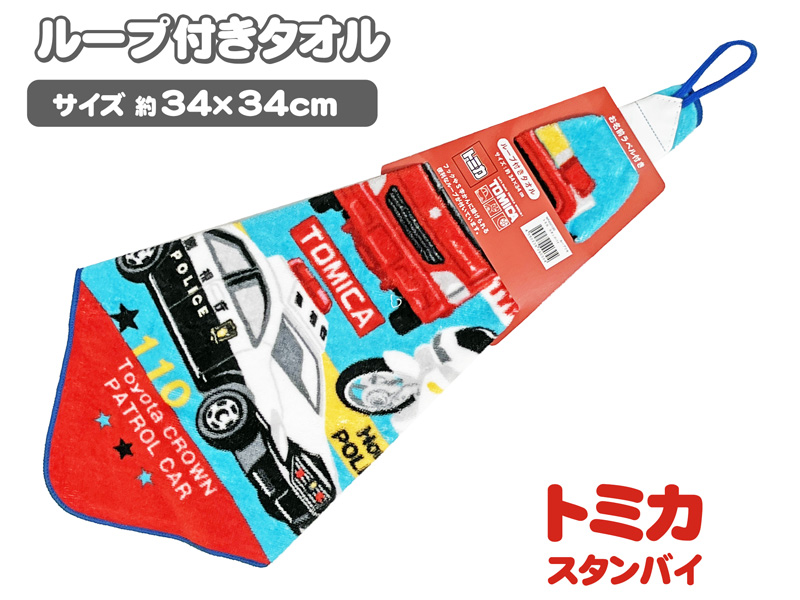 フックに掛けて使える便利な「トミカ・スタンバイ」のループ式タオルが登場!!幼稚園・保育園で毎日使うものだから、お子様もお気に入りのキャラクターを使いたいですよね。タオルはコットン100%で肌触りもバツグンです。