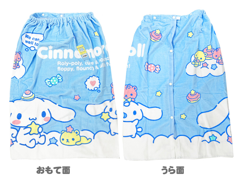 プールや海水浴、水遊びなどで活躍!!「シナモロール」の80cm丈スナップ付きラップタオルが登場。巻きタオルは、スカートやポンチョのようにさっとカラダに巻いて使えるのでお着替えするのにとっても便利♪ゴムとスナップボタン付きでウエストサイズの調節も可能。綿100%なので吸水性も良くスイミングやお風呂上がりにも大活躍ですね。