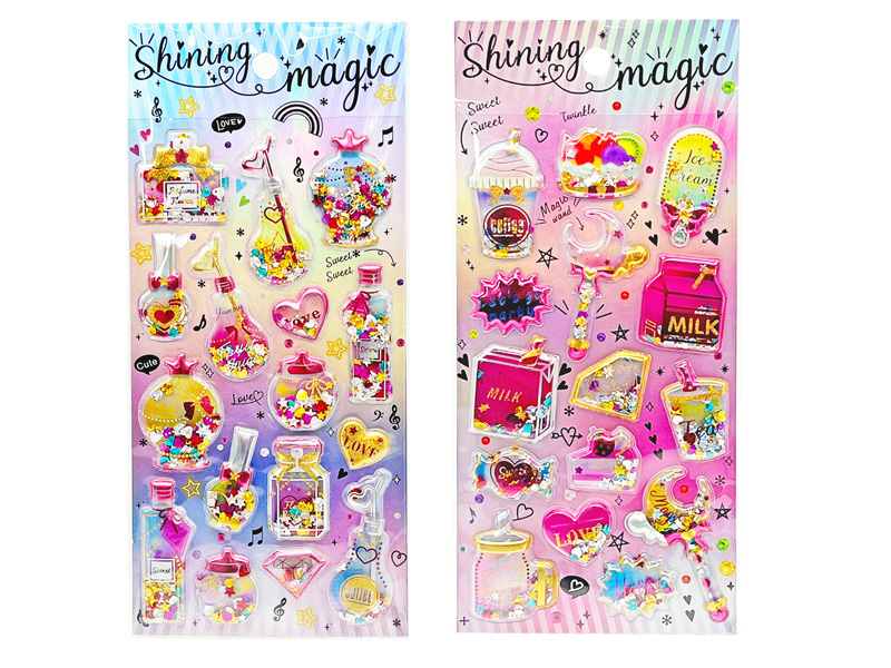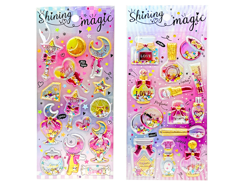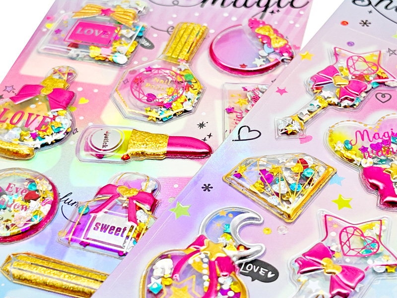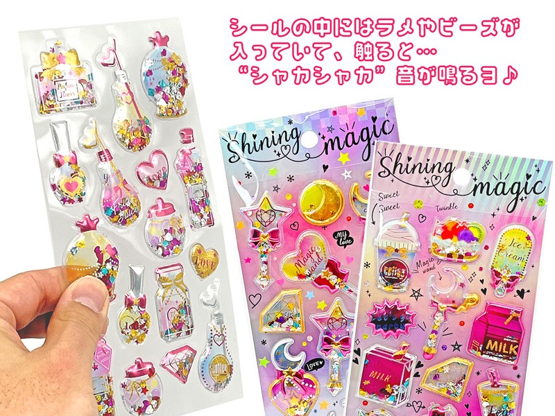 動くたびにキラキラ揺れる♪『シャカシャカシール』が新入荷♪シールの内部には…ラメやビーズが入っており、触ると“シャカシャカ”音が鳴る、大人気の立体シールです!!手帳やノートの表紙・スマホケース・お手紙・アルバムなど、貼るだけでグッと可愛く仕上がります♪女の子向けのご褒美景品やプチギフトにもおすすめです!