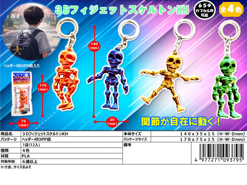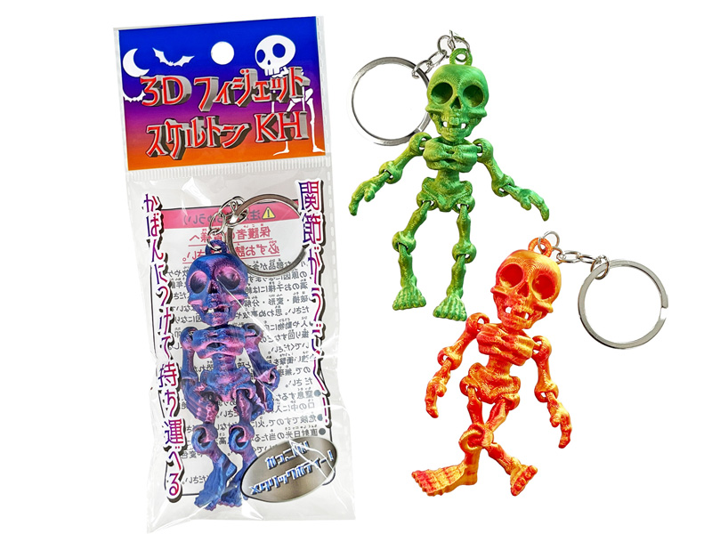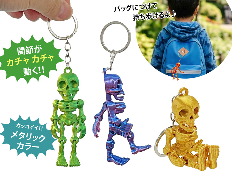 全長約14cm!リアルなガイコツデザインのマスコットキーホルダーが新登場!手足の関節が自由にクネクネ動くので、どんなポーズも自由自在!かっこいいメタリックカラーの本体は全4パターン。キーホルダーがついておりますので、かばんやリュク等から下げることができます。通常のイベント景品にはモチロン、ハロウィンシーズンのプレゼントにもオススメです♪