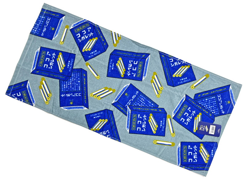 ロングセラー駄菓子【ココアシガレット】デザインのフェイスタオルが登場~♪表はシャーリング加工、裏はパイル地で肌触りなめらか。綿100%で吸水性もバツグン!低価格でインパクトも強いため、子供会や学校行事の景品、企業のノベルティグッズとしても最適です。