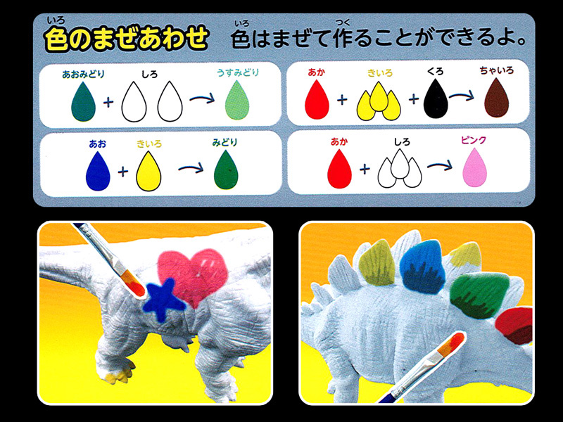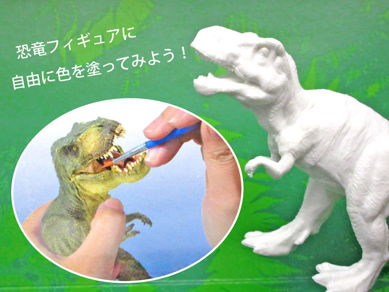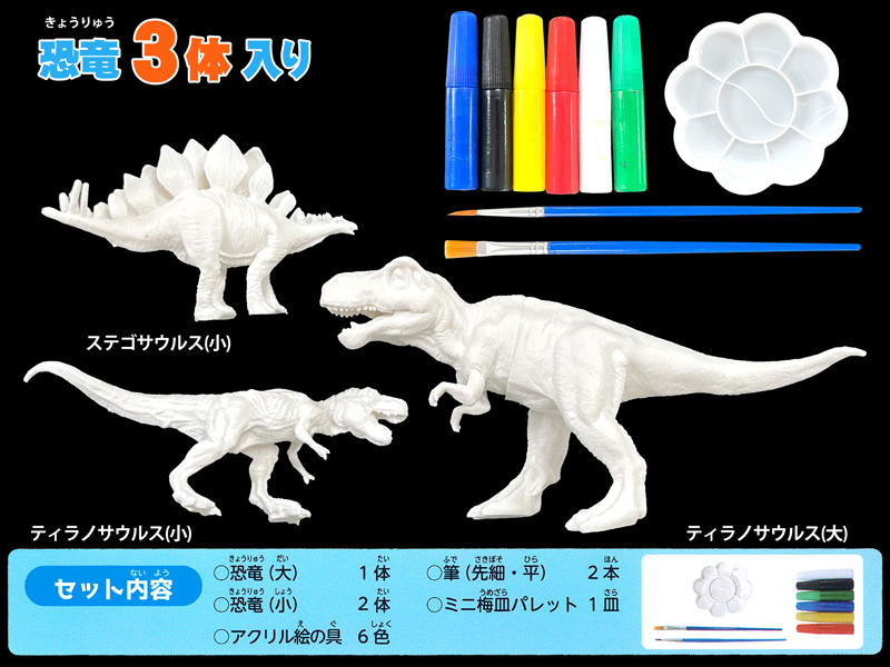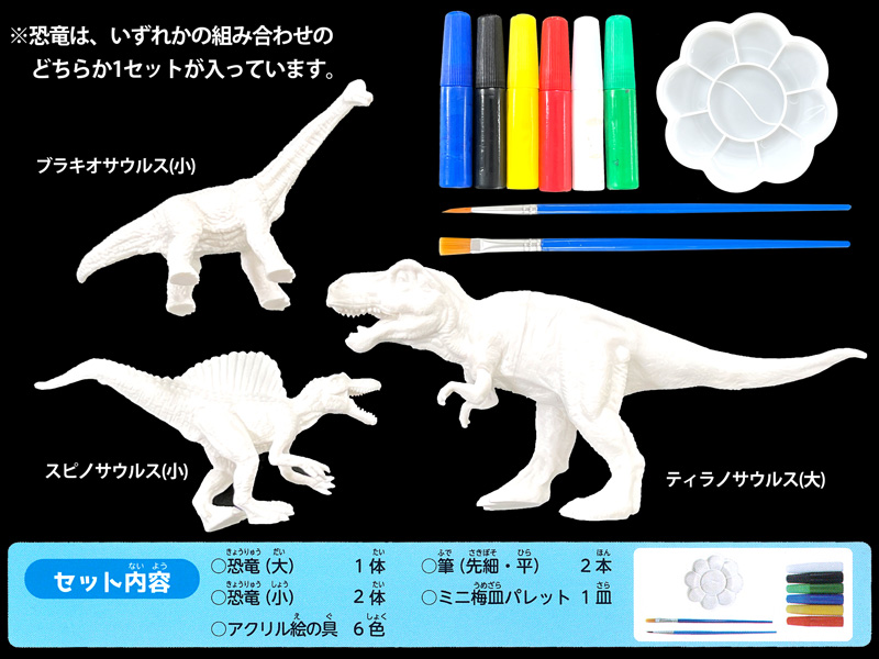 - 【セット内容】恐竜フィギュア×3体(大×1/小×2)、アクリル絵の具×6色、筆×2本(平×1/先細×1)、ミニ梅皿パレット×1