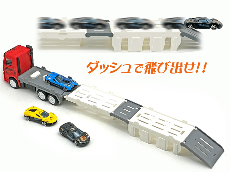 ミニカーを運ぶことができる!ダッシュキャリアカーセットが登場!キャリアトラックは手で押して走るフリクション仕様!さらにトラックの荷台部分を広げミニカーをセット、ボタンを押すとミニカーが勢いよく発射されます。紙コップを並べるなどして、様々なカースタントに挑戦してみよう!本体の仕様は全部2タイプ。男の子向けのお誕生日プレゼントや各種イベントの景品玩具などにもオススメです!