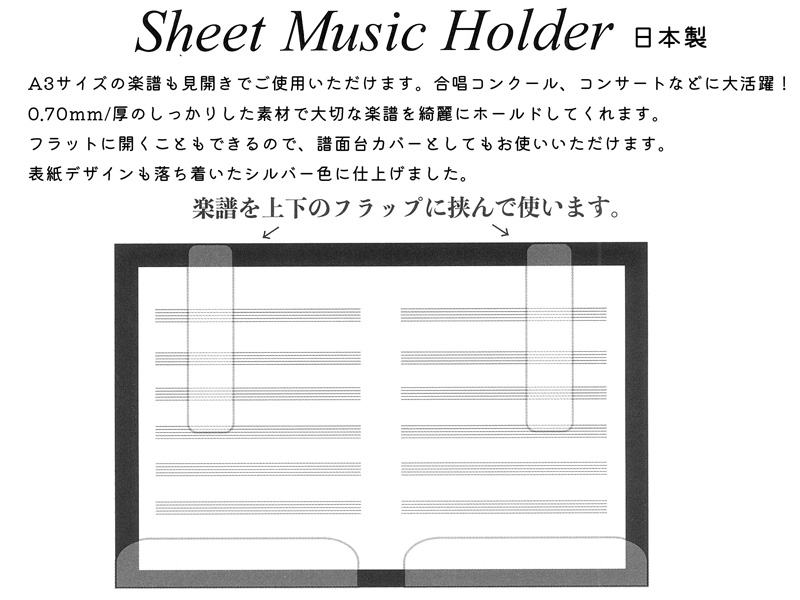 楽譜や譜面台カバーとしても使えるシートミュージックホルダーです。A3サイズの楽譜も見開きでご使用いただけます。合唱コンクール、コンサートなどに大活躍!0.70mm厚のしっかりした素材で大切な楽譜を綺麗にホールドしてくれます。