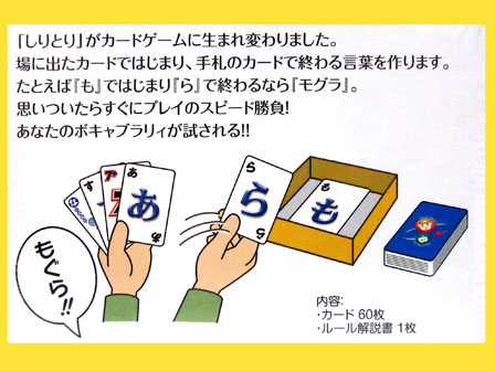 あなたのボキャブラリーを試される!「しりとり」がカードゲームになりました。箱の中にあるカードの文字ではじまり、自分の持っているカードの文字で終わる3文字以上の言葉を考え、思いついたらその言葉を言いながら該当するカードを箱の中に投げ入れます。その瞬間からすべてのプレーヤーは新しい箱の中の文字ではじまり自分の持っているカードで終わる言葉を考えるのです。このゲームには順番はありません。思いついたらどんどん言葉を言ってカードを箱に投げ入れます。最初に手札をすべてなくしたプレーヤーの勝ちとなります。