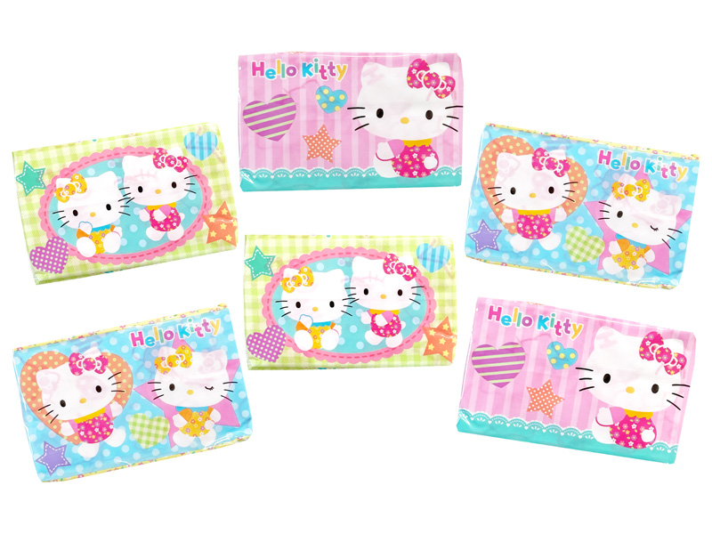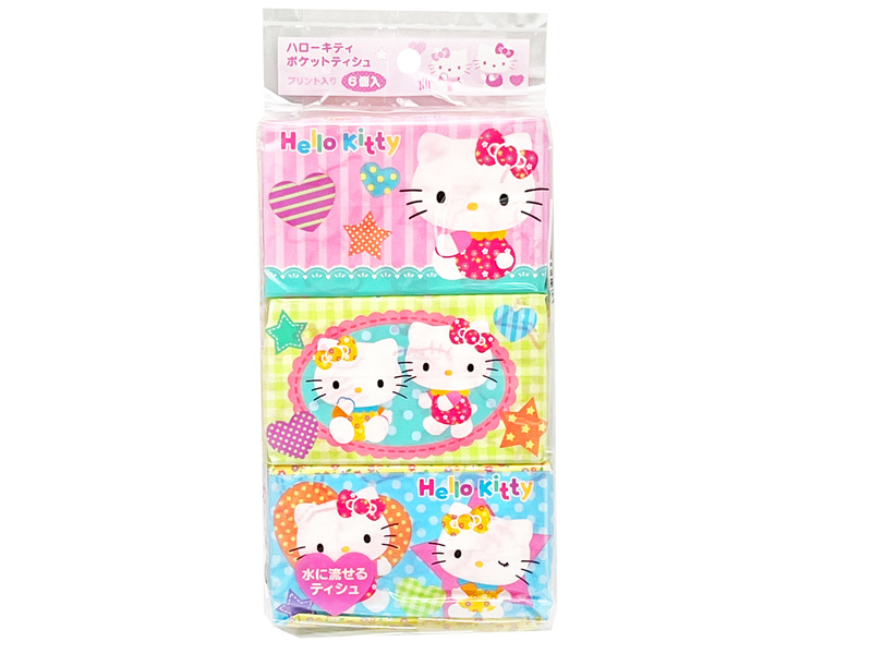 「ハローキティ」柄の水に流せるプリント入りポケットティッシュが6コ入ったセットです。そのまま個人使いもOKですし、バラして参加賞やくじのハズレ景品、販促品としても使えます!