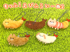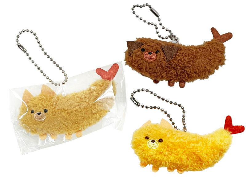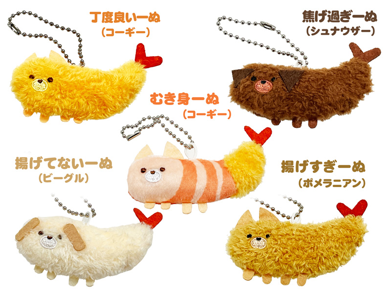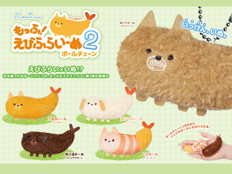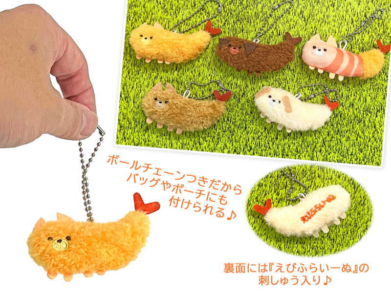 カラッと揚げたて…!?衣をまとったゆる?いもふもふワンコのマスコット『もっふ!えびふらいーぬ』が登場♪ユニークで可愛いマスコットは全5種類。ボールチェーンつきなのでバッグやポーチに付けて持ち歩けます。