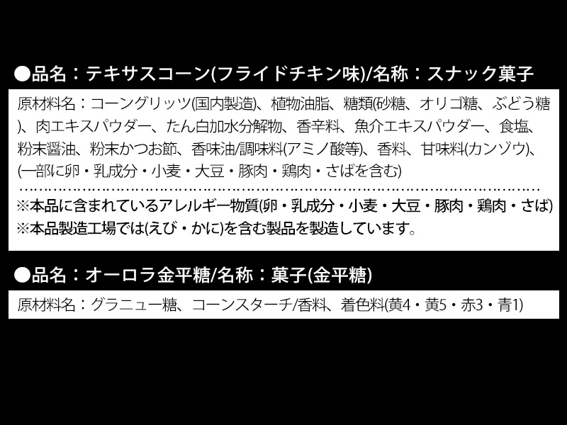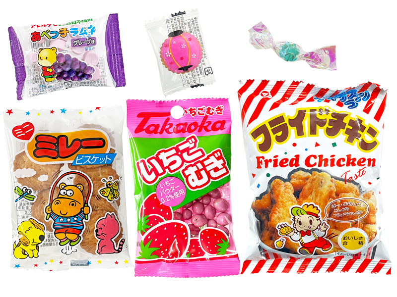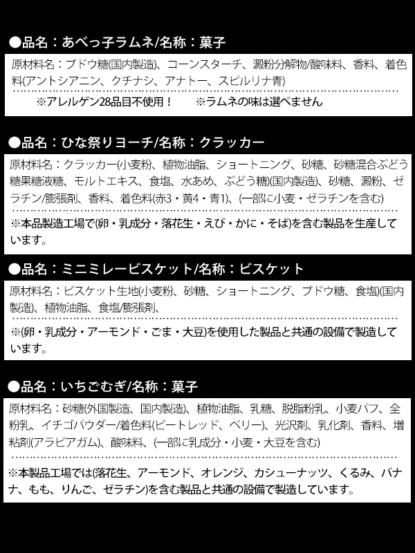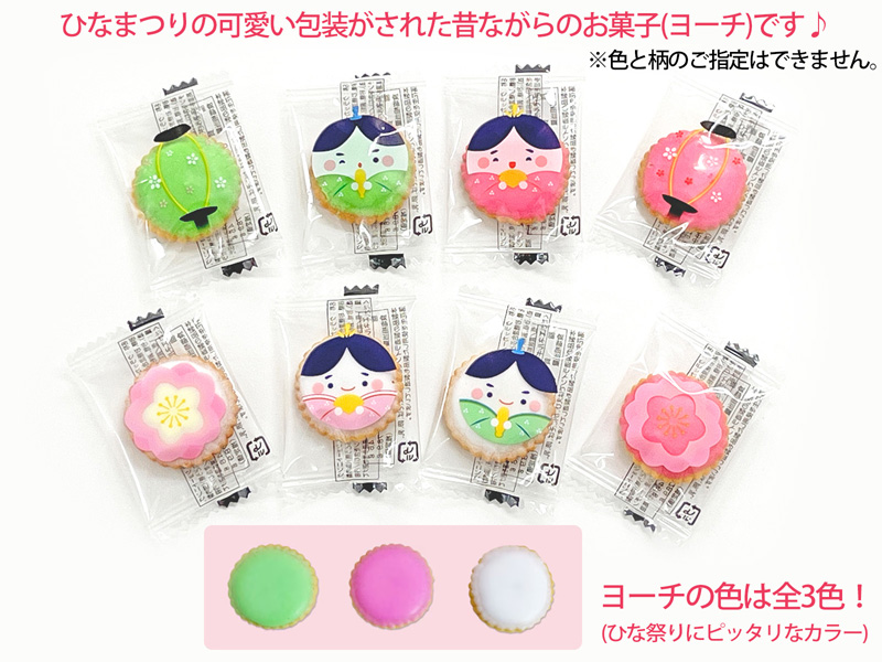 - セット内容:雑貨(ひなまつり巾着×1) お菓子(ひな祭りヨーチ×1・あべっ子ラムネ×1・テキサスコーン(フライドチキン)×1・ミニミレービスケット×1・オーロラ金平糖×1・いちごむぎ×1)
