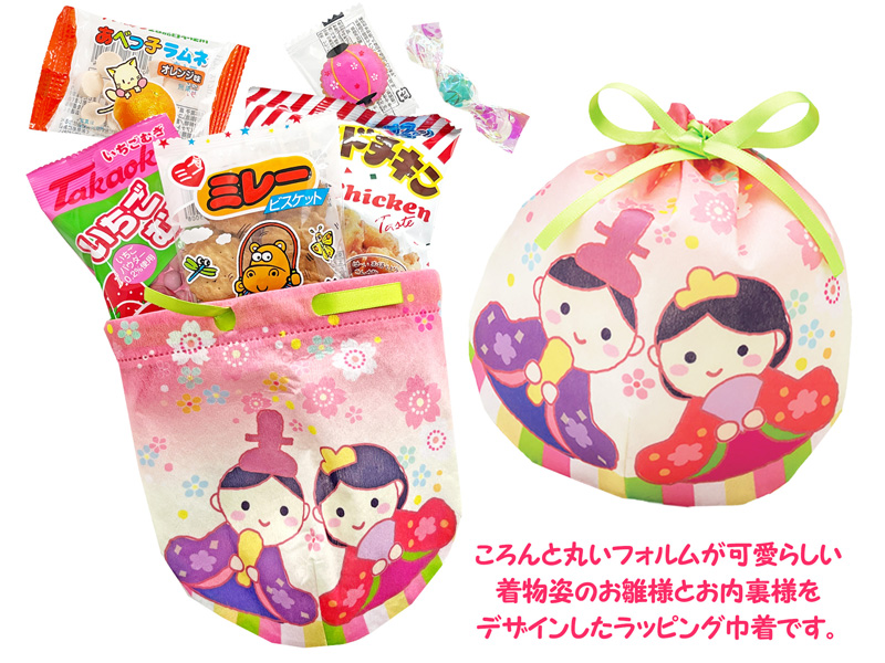 ころんと丸いフォルムがとってもキュート♪着物姿のお雛様とお内裏様が仲睦まじいラッピング巾着ギフトが登場~♪♪巾着のヒモをほどくと中にはいちご味の麦チョコや安部製菓さんのフルーツラムネ等々etc…全6種のお菓子が入ってる!まんまるフォルムの巾着は店頭ディスプレイにも映え、季節演出アイテムとしてもおすすめです♪