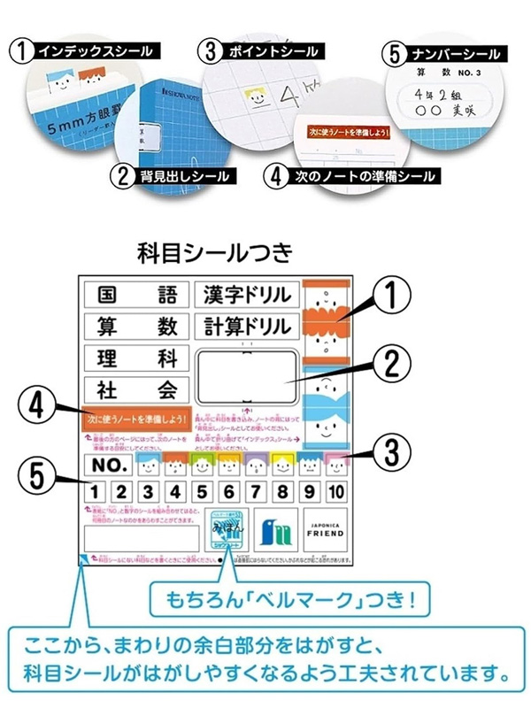 子どもたちに笑顔と元気を届けたい、そんな思いで作ったジャポニカの学習ノート5冊パックです。便利な科目シールつき。本文は科学データにもとづく書きやすい罫色。鉛筆でも書ける名前欄。