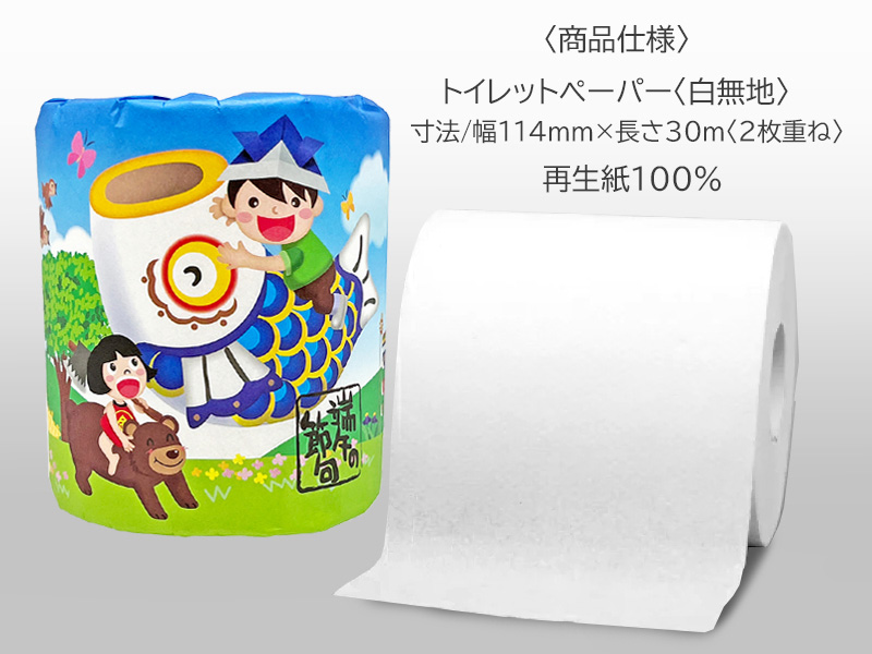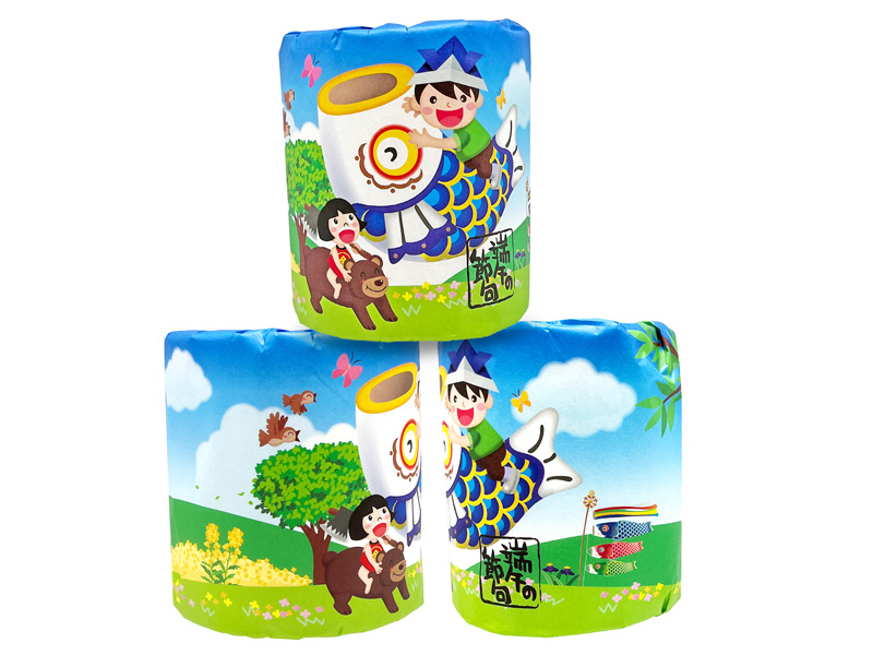 こどもの日の時期の各イベントで使えるトイレットペーパーが登場♪包装紙にこどもの日にぴったりなイラストが描かれたトイレットロール。中身は普通のトイレットペーパーなんですが、こういったユニークな包装がしてあるだけ心がウキウキしてきますよね。積み上げて置けばインパクト大!一年で一回しかない特別なイベントでの景品、配布品に最適なトイレットペーパーです