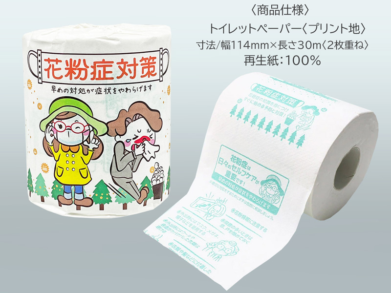 - ペーパーロール仕様…プリント生地:(花粉症対策と症状チェックをプリント)/サイズ:幅114mm×長さ30m(2枚重ね)