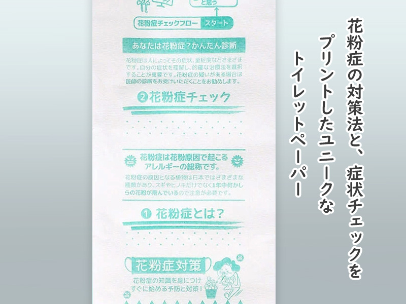 花粉症が始まる季節におすすめ!!『花粉症対策』トイレットペーパーが登場!こちらは、花粉症の知識や予防と対策・花粉症のセルフチェックまでできる、とってもユニークなプリントロール。トイレに行くたびに知識がつきそうですネ。日常的に使用するトイレットペーパーはもらってうれしい販促品!花粉が飛び交う春先の販促・啓発用トイレットペーパーに最適です。