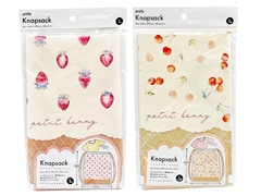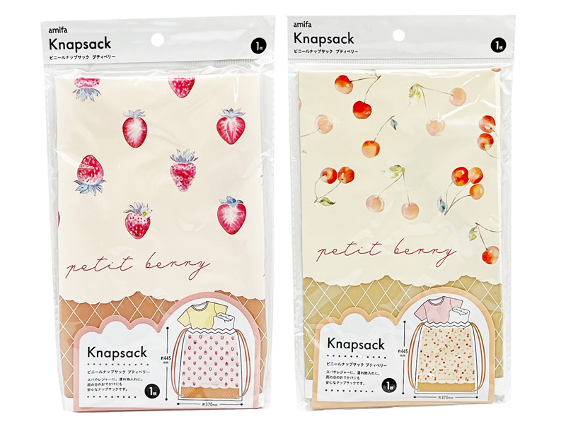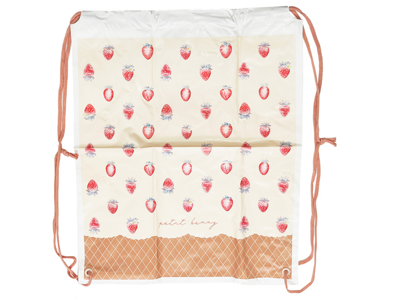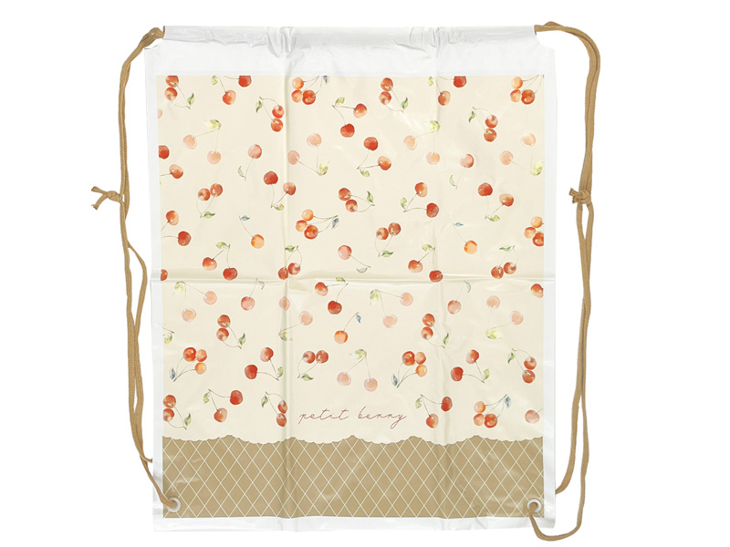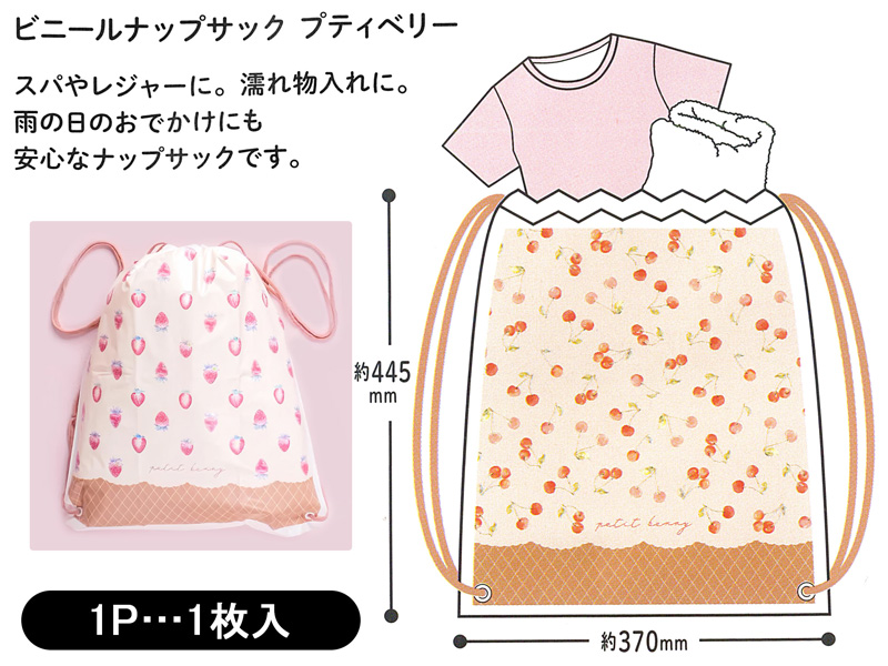『ストロベリー&チェリー』デザインのビニールナップサックが登場♪こちらは…バッグの口を絞ると背負える形になる、持ち運びやすいビニールバッグ。水に強い素材で、海やプール、スパで濡れ物を入れるのに便利です。