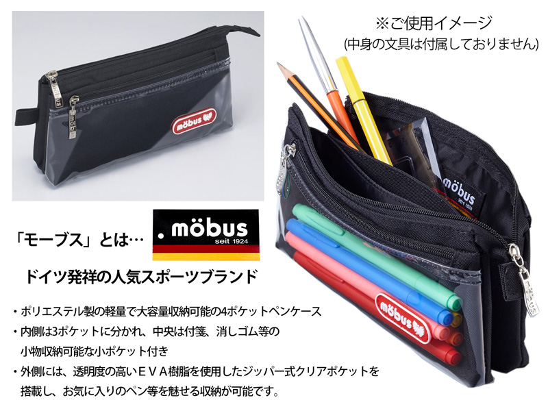ドイツ発祥の人気スポーツブランド「モーブス」のペンケースが登場!こちらはポリエステル製の軽量で大容量収納可能の4ポケットペンケース。内側は3ポケットに分かれ、中央は付箋、消しゴム等の小物収納可能な小ポケット付き!・外側には、透明度の高いEVA樹脂を使用したジッパー式クリアポケットを搭載し、お気に入りのペン等を魅せる収納が可能です!