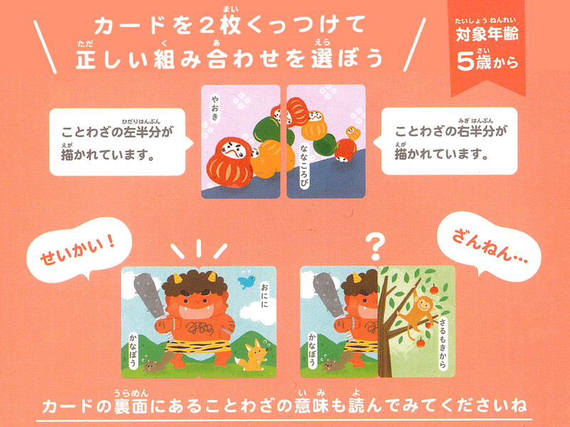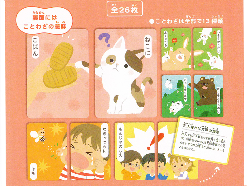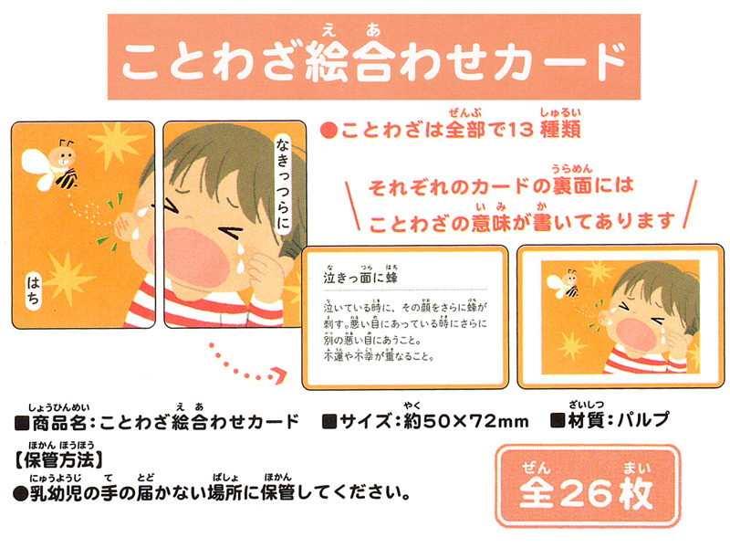 日本のことわざを楽しむ知育カード【ことわざ絵合わせカード】が登場♪ことわざの左半分と右半分が描かれた、2枚のカードをくっつけて正しい組みわせを選ぼう!それぞれのうら面には、ことわざの意味が書いてあります。小さなお子様向けのプレゼント・知育玩具にゼヒ!